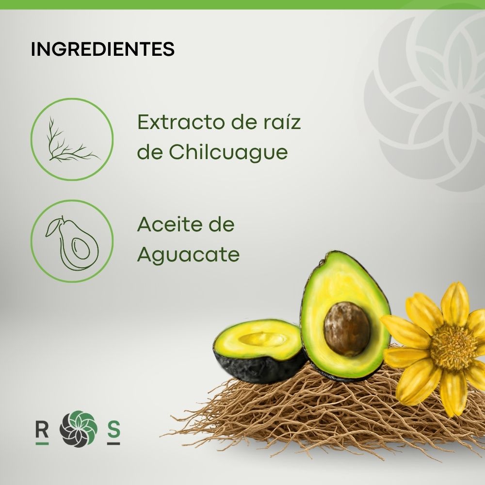 Aceite de aguacate, extracto de raíz de Chilcuague "Heliopsis longipes". Sin alcohol, sin conservadores o saborizantes artificiales.