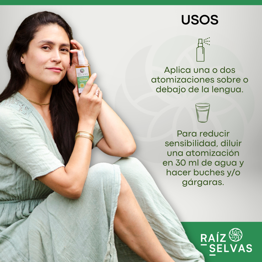 • Para reducir sensibilidad, diluir una atomización en 30 ml de agua y hacer buches y/o gárgaras