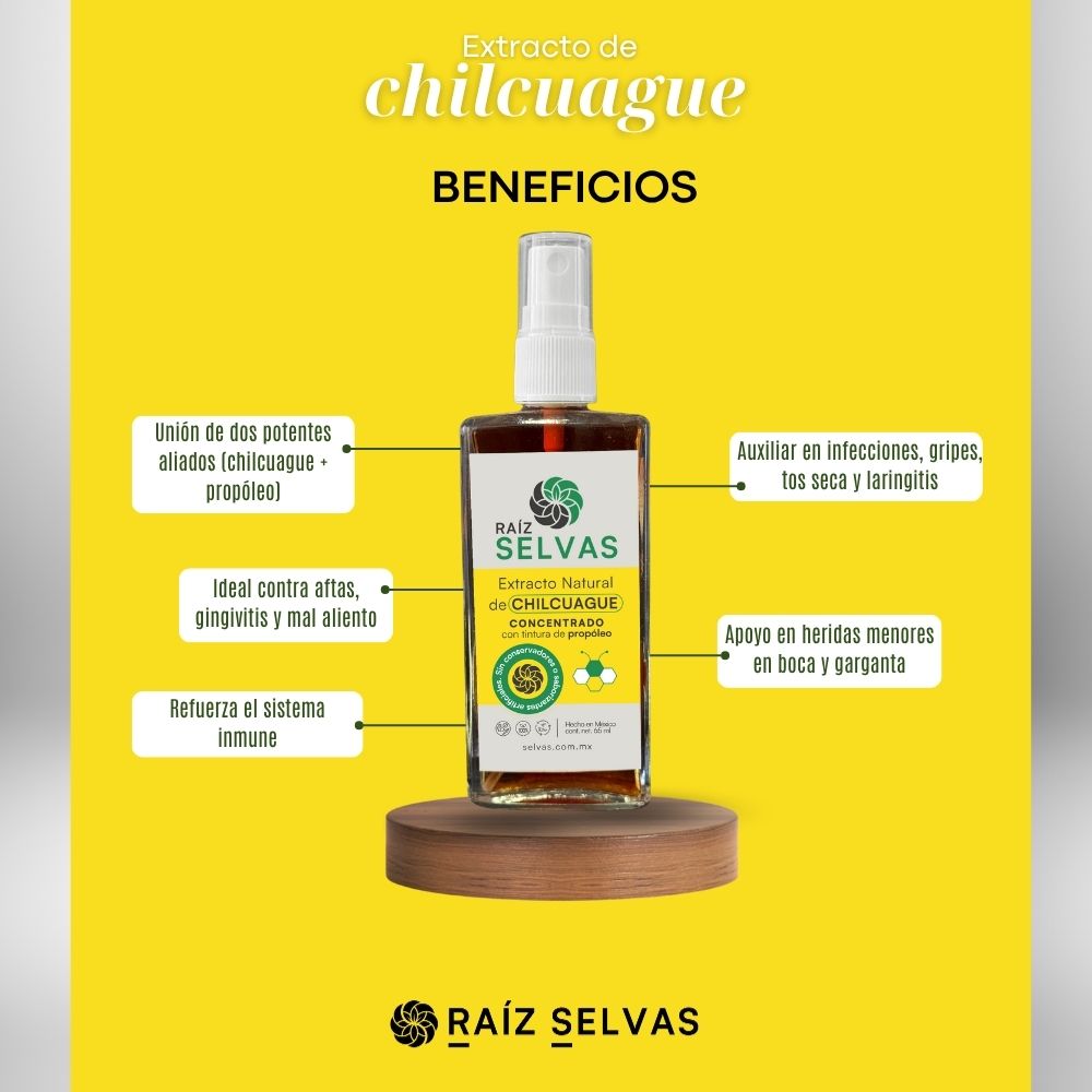 Extracto de raíz de chilcuague Heliopsis longipes, tintura de propóleo, alcohol de caña de azúcar Saccharum officinarum.