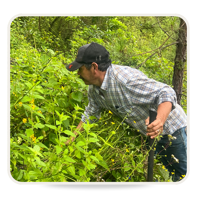 Sembramos y cosechamos la planta de chilcuague a través de prácticas agrícolas libres de agroquímicos. También estamos desarrollando proyectos agroforestales para favorecer la diversidad de especies y reducir la erosión del suelo entre otros beneficios.